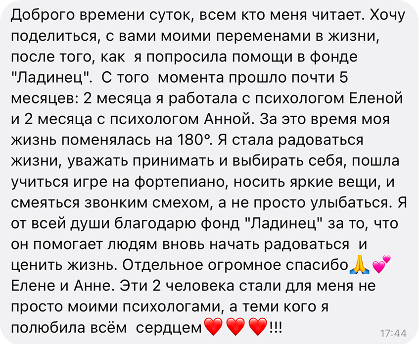 в травме. Знаю, как важно иметь поддержку. И знаю, что когда ты сам прошел через испытание, появляется особая ответственность — протянуть руку тем, кто сейчас проходит свой путь. Вместе мы можем создать цепочку добра, где каждый, кто получил помощь, становится опорой для других.